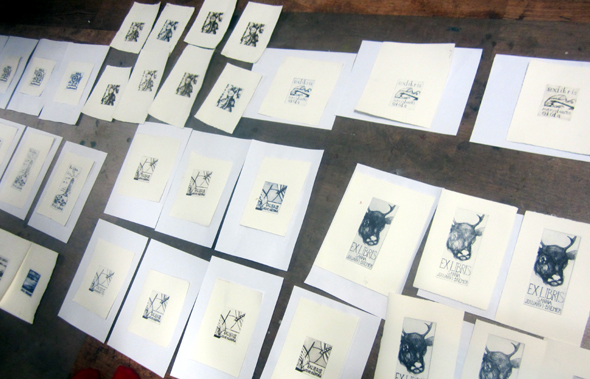 Lauantain ja sunnuntain ohjelmassa oli ex libristen teko kuivaneulalla pienille kuparilaatoille. Opettajamme Hilja Jylänki kiersi tarkistamassa, millaisia uria saimme aikaiseksi etsauspiikeillä. Lähes jokainen sai komennon, jatka ja syvennä. Sunnuntaina ensimmäiset koevedokset kertoivat, että hän oli oikeassa. Urien piti olla tasalaatuisen syvät, ennen kuin väri toistui kauniisti. Minä olin tässä lajissa täysin tumpelo. Kuva kyllä onnistui, mutta tekstit pomppivat sinne tänne. Lupasin tehdä uuden version, kunhan pääsen omalle grafiikkapajalle ja voin syövyttää viivat.