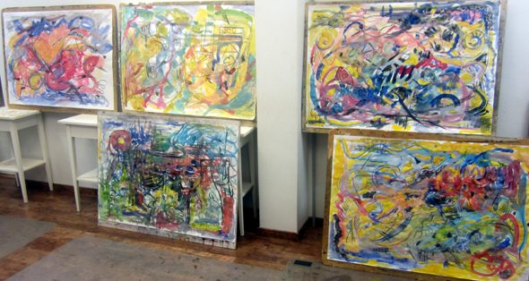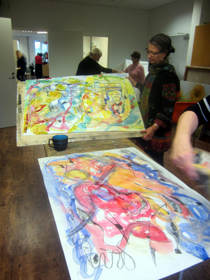 Iltapäivällä pääsimme irrottelemaan. Eila jakoi neljän hengen ryhmille isot litoposterit ja vesivärit sekä siveltimet. Maalasimme ensin pohjan katsomatta paperiin. Seuraavaksi saimme käteemme hiilet. Tehtävänä oli saada aikaiseksi kiinnostavia sommitelmia. Vaihdoimme vilkkaasti paikkaa ja jatkoimme vapaata maalaamista. Olimme kaikki aivan häikäistyneitä lopputuloksesta. Miten kiehtovaa onkaan luoda jotain täysin ilman ennakkosuunnitelmaa.