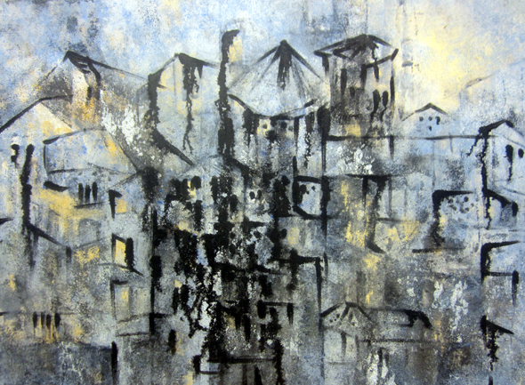Kotona on meneillään ikkuna- ja parvekeremontti. Huonekalut on kasattu keskelle huoneita ja peitelty muoveilla ja lakanoilla. Kotona ei todellakaan ole viihtyisää. Ulkona sataa päivästä toiseen. Niinpä minä olen linnottautunut työhuoneelle. Siellä on kodikasta. Öljyvärit ja dammarvernissa tuoksuvat. Ikkunat saa onneksi auki, etten ole aivan huumeessa.