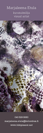 Teetin viime keväänä 100 kappaletta kirjanmerkkejä, joissa oli yhteystietoni. Kuvittelin, että ne riittävät ensi kesään asti, jolloin valmistun taidekoulusta. Toisin kävi. Helsingin kirjamessujen yhteydessä Art Forumissa kaikki käyntikortit loppuivat kesken. Niinpä ei auttanut muu kuin päivittää tiedot. Kiitokset taas kerran graafikkopojalleni Miikalle, joka hoitaa ammattitaitoisesti maman käyntikortit ja näyttelyjulisteet.
