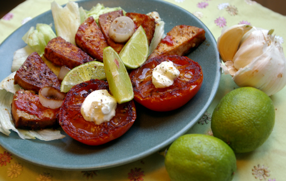 Minun versiossani on runsaasti valkosipulia, soijaa ja chiliketsuppia sekä tuoretta limetinmehua. Lisään vielä syöntivaiheessa sinappia. Tuore inkivääri ja korianteri sopivat myös, mutta nyt niitä ei ollut käytettävissä. Paistetut tomaatit sopivat hyvin makuyhdistelmään.