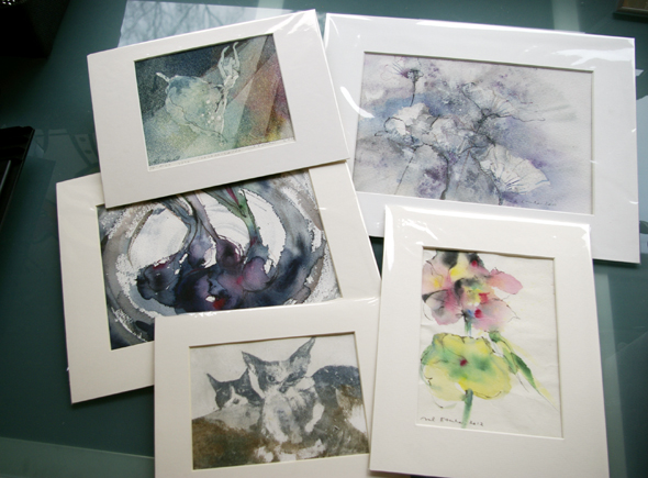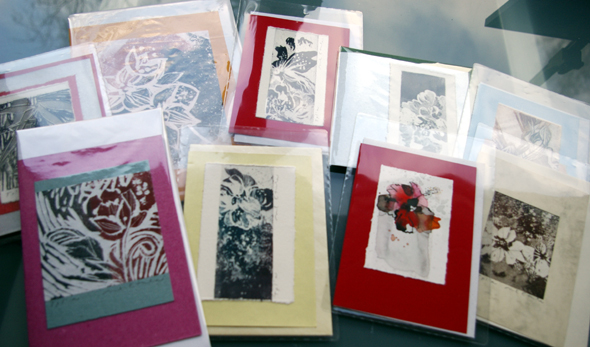 Korttien lisäksi myynnissä on edullisia grafiikan vedoksia ja lahjoiksi sopivia pikkutauluja. En tiedä onko laman vika, taidekauppa käy edellisiä vuosia heikommin (vai olisko taso laskenut?), mutta yritän silti toivorikkaasti. Ja aina on hauska tavata tuttuja glögin ja rupattelun merkeissä.