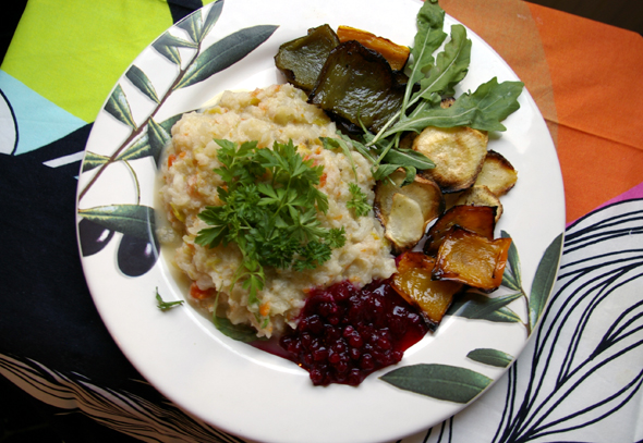 Tein sunnuntaipäivän kunniaksi kukkakaalimuhennoksen. Mukana oli myös kyssäkaalia – joka on ihanaa myös raasteena – sekä tuoretta inkivääriä sekä tietysti kelta- ja valkosipulia. Paahdoin uunissa värikkäitä paprikoita ja ohuita palsternakkasiivuja. Ei haittaa, vaikka pinnat saavat vähän liikaakin väriä. Kun mustuneet kohdat poistaa, alta paljastuu makeaa herkkua. Terveellinen ateria maistui salaatin ja puolukkahillon kera.