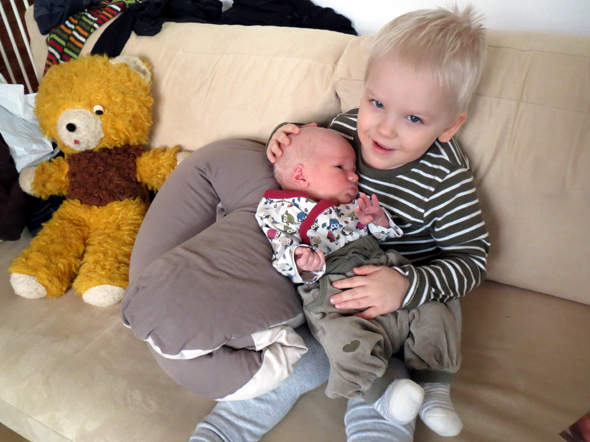 Minulla on ollut ilo viettää viikko Espoossa Miika-pojan perheessä. Apukädet ovat aina tarpeen, varsinkin kun nuorimmainen on vasta vajaan kahden viikon ikäinen. ”Otso haluaa vauvan sylkkiin”, isoveli vaati. Hellästi hän piteli pikkuveljeä ja me papparazzit otimme tietenkin vauhdilla kuvia.