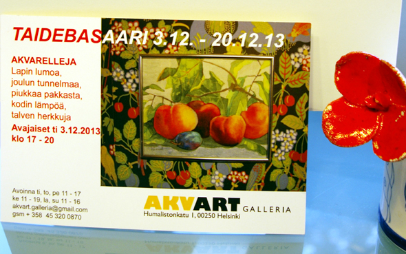 Kun yksistä joulumyyjäisistä selvittiin, heti perään on toinen. Kävin tänään pikaisesti pikajunalla Helsingissä ripustamassa AkvArt gallerian alakertaan muutaman grafiikanvedoksen. Basaaripöydältä löytyy sen lisäksi kortteja ja telineestä lisää grafiikkaa. Lapin maalarit valtasivat yläkerran. Koska osallistuin edellisenä syksynä Suomen Akvarellitaiteen yhdistyksen järjestämälle ruskaleirille, sain minäkin pari maalausta sinne mukaan.