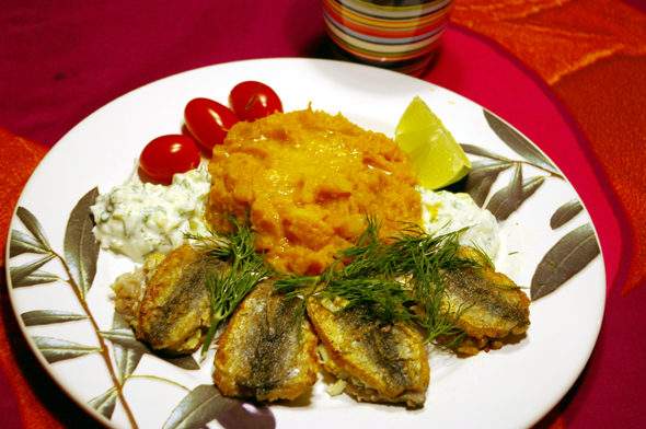 Jussi oli tänään kokkina. Hän paistoi silakkapihvejä. Fileiden väliin hän laittoi kermaviili-purjo-tilliseosta. Minä pyöräytin bataattisoseen kyytipojaksi. Minun makuuni bataatti on turhan makea. Kunnon perunamuhennos olisi sopinut paremmin, mutta tulipa nyt kokeiltua tällaistakin versiota.