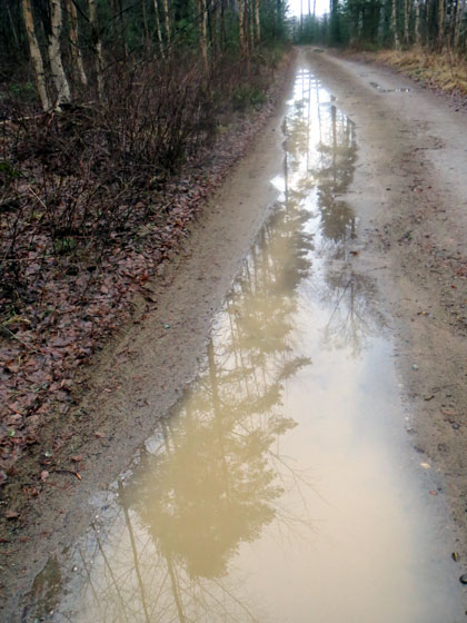 Tein pitkän kävelylenkin sateenkostealla metsätiellä. Lisäsin vauhtia, kun pensaikosta kuului läähätystä. Täällä on paljon peuroja ja hirviä. Liekö karhutkin hereillä?