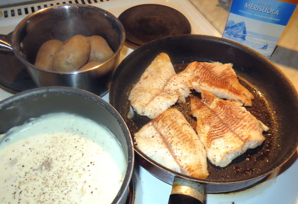 PERUNAT, VALKOKASTIKE SEKÄ HAUKIFILEET KYPSYMÄSSÄ