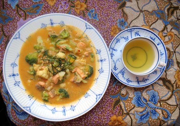 Sekoitin pari ruokalusikallista currytahnaa kookosmaitoon. Kiehautin sen ja lisäsin kypsymisjärjestyksessä sipulia, valkosipulia, tuoretta inkivääriä, juuriselleriä, kukkakaalia, parsakaalia, tomaatti- ja lohikuutioita. Viimeistelin maun tilkalla soijaa, limetinmehua ja korianteria.