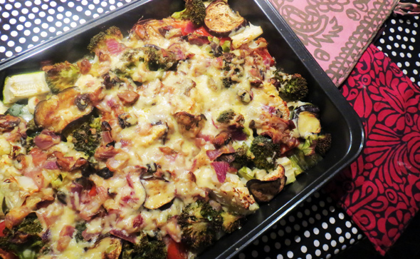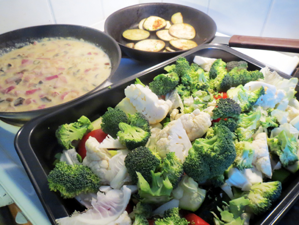 Juhlaherkkujen jälkeen kaali maistui jälleen. Pilkoin uunivuokaan kukka- ja parsakaalia, purjoa ja tomaatteja. Leikkasin munakoison ohuiksi viipaleiksi ja kuullotin ne pannulla. Sulatin pakastimesta pussillisen tatteja. Tein tukevan valkokastikkeen ja lisäsin siihen sienet ja sipulit. Peittelin kaalit kastikkeella ja laitoin 175 asteiseen uuniin 45 minuutiksi. Lisäsin loppuvaiheessa pinnalle juustoraastetta. Tuoksuva arkiruoka kelpasi hyvin pakkaspäivänä.