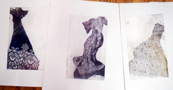 Minä olin ennakoinut kurssia tekemällä paperihuoneella pitsipohjia. Jatkoin niiden työstämistä akvatintalla. Suunnitteilla on pitsimekkosarja, jonka taustat telaan toisiinsa sointuvilla väreillä.