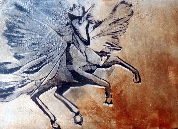 Yksisarvinenkin kiiti lentoon, kun sai väriä siipiensä alle. Meillä on ensi torstaina kevään viimeinen grafiikkakurssipäivä. Ajattelin silloin tummentaa koiralaattoja ja tehdä vielä pari uutta pitsiversiota.