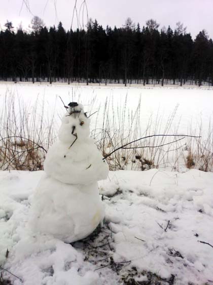 Viime viikolla Hämeessä oli kunnon pakkaset. Ulkoilimme posket punaisina. Nyt helmikuun koittaessa kelit ovat olleet lauhat ja pilviset. Lenkkeilimme taas tänään tuttuun tapaan Aulangolla. Matkalla meitä tervehti iloinen lumiukko.