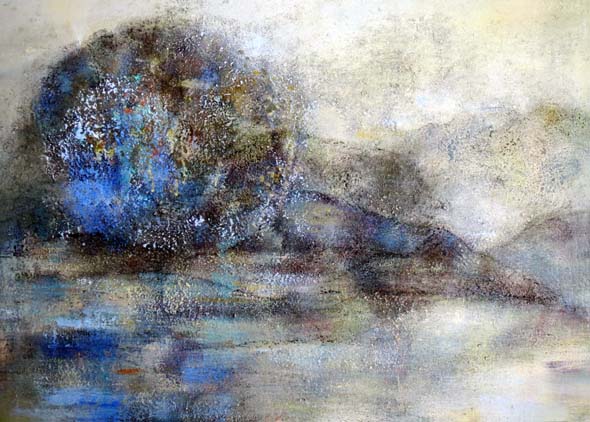Olen ahkeroinut työhuoneella lähes joka päivä. Tosin vain kaksi-kolme tuntia kerralla. Sinä aikana ehtii hyvin jatkaa paria työtä ja jättää sen jälkeen värit kuivumaan seuraavaan päivään. Sininen maisema on loppusuoralla. Siinä on maalikerroksia ties kuinka monta. Odottelen mitä ohjaaja tuumii ja jatkan vasta sitten.