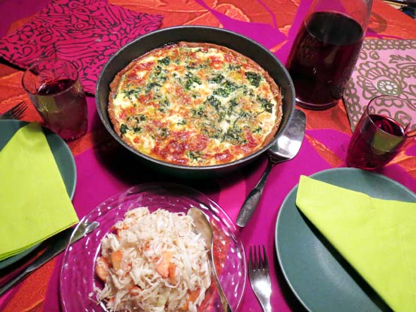 Pinaattihaaste jatkuu. Kysyin päiväkävelyllä Jussilta, mitä voisimme laittaa pinaatista. Ennen kuin hän ehti edes miettiä, keksin että juhlissa tarjotaan yleensä feta-pinaattipiirakkaa. Niinpä meillä tuoksui illalla vastaleivotulta. Tosin ostin rukiisen piirakkapohjan valmiina.