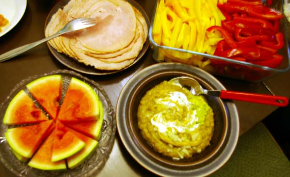 Ruokalista on aina sama. Pikkupurtavaa ja punssia (aikuisille) ennen ulkoilua, sitten posket punaisina höyryävää hernekeittoa ja jälkiruuaksi pannukakkua, kermavaahtoa ja hilloa. Nam.
