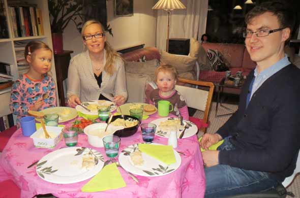 Jussin verkoista nousee edelleen kuhia ja haukia. Houkuttelin kummityttöni Päivin ja hänen perheensä meille kalaillalliselle. Pikkuväki oli innostuneempi viinirypäleistä, jäätelöstä ja vadelmahillosta. Meille aikuisille maistui niin suolainen kuin makeakin. Päivi arveli, että jäätelö korvasi tänään tyttöjen iltapuuron. Onneksi kylässä kaikki on sallittua.