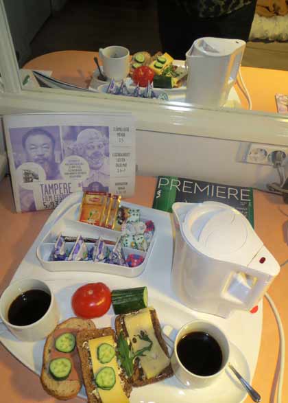 Vietimme hauskan viikonlopun Tampereella elokuvajuhlien merkeissä. Yövyimme oikein hotellissa, vaikka kotiin olisi ollut vain vajaan tunnin matka. Koska majoitukseen ei kuulunut aamiaista, Jussi säästäväisenä miehenä teki meille eväät matkaan. Hän tietää, että vaimo on kiukkuinen, jos ei saa aamukahvia heti herättyään. Huoneesta löytyi vedenkeitin ja kahvitarpeet. Näillä eväillä pääsimme mukavasti matkaan katsastamaan tämän vuoden palkitut elokuvat.