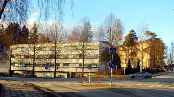 KOTITALOMME TAKANA NÄKYY KELTAINEN RAKENNUS, JOSSA ON LÄHIKIRJASTO