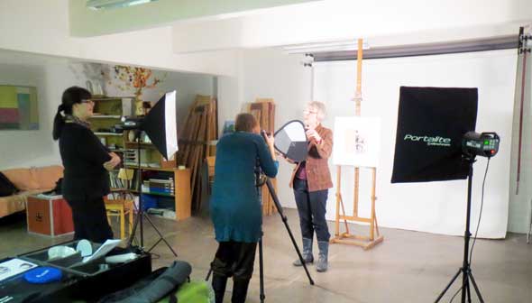 Hämeenlinnan taiteilijaseuralla on käytössä täydellinen valokuvauskalusto, jota saa lainata. Testasimme paperihuoneen graafikoiden kanssa laitteet. Pystytimme kameran ja valot taidekasarmille, jossa seuralla on työtila. Tämä on loistava mahdollisuus saada omista töistä laadukkaita valokuvia. Varsinkin talvella, kun luonnonvaloa ei ole, kuvaaminen on yhtä tuskaa.