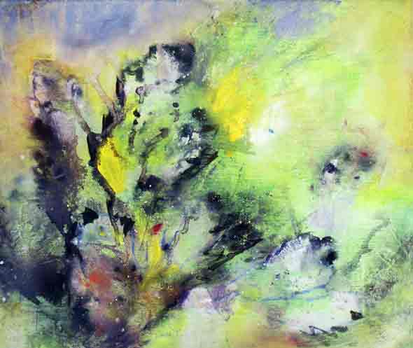 Tein lauantaipäivän päätteeksi kaksi väripohjaa – mustan ja limenvihreän.  Niistä oli hauska aloittaa sunnuntaina uudet maalaukset.  Irrottelin kunnolla, sillä viimeinen kurssipäivä on aina se rennoin.   ”Hyvä tyyli”, kurssitoverit kommentoivat katselmuksessa.