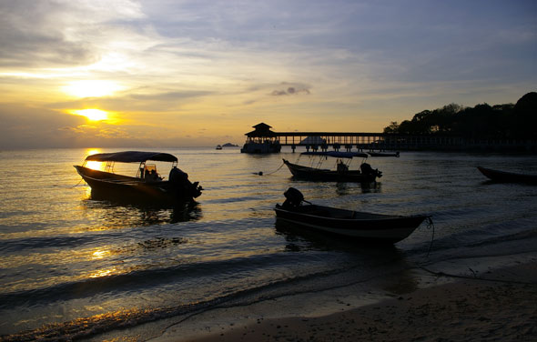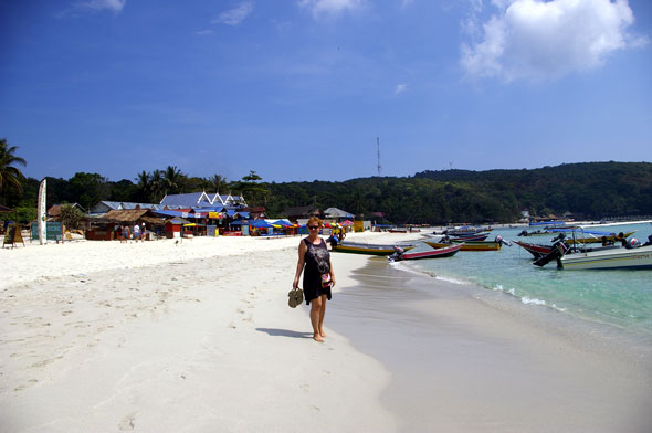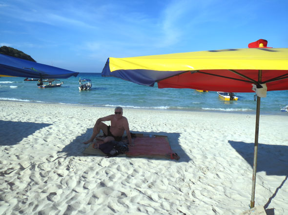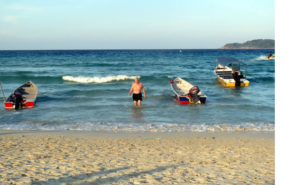 Edestakaiset laivaliput maksoivat 70 (noin 16 euroa) ringettia hengeltä. Meri kimmelsi tyynenä. Malesian itärannikolla on nyt meneillään kuiva kausi. Sateita ei ole näköpiirissä. Puolen tunnin venematkan jälkeen rantauduimme saarista pienemmälle Coral Bayn lahteen. Toivoimme löytävämme sieltä mökin tuleviksi viikoiksi.