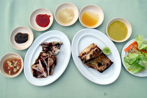 Jääpalatiskiltä sai valita grillattavaksi kaloja, rapuja, mustekalaa tai kanaa. Minä valitsin mustekalan, Jussi kingfishin. Buffetpöytä tarjosi keittoa, suuren kulhollisen vihreää salaattia (maistui ihanalle), riisiä, paistettuja nuudeleita ja sardiineja sekä kymmeniä erilaisia maustekastikkeita. Jälkiruuaksi tarjolla oli hedelmiä, mangohyytelöä, kahvia ja teetä. Olimme oikein oikein tyytyväisiä ja suunnittelimme menevämme sinne vappunakin.