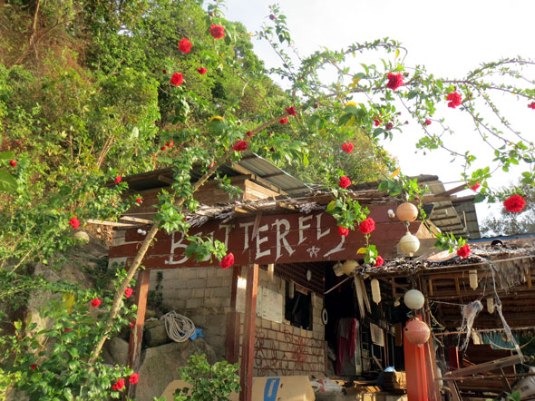 Kiipesimme rinkkoinemme kiinanruusuportin läpi uuteen majapaikkaamme Butterflyhin. Tunsin heti, että täällä minä viihdyn. Maja on vaatimaton, mutta kuvankauniilla paikalla kallioilla aivan meren rannalla. Tilava parvekkeemme on melkein meren päällä. Ja minkä parasta, merituuli puhaltelee raikkaasti. Sisällä kalustuksena on vaaleanpunaisen sääskiverkon verhoama parisänky, pari hyllyä, seinässä koukkuja, oma wc ja suihku. Olohuoneemme – siis parveke – on täydellinen. Palmu huojuu kodikkaasti tuulessa aivan kaiteen takana. Parasta kaikesta on tilava ja tukeva pöytä, jonka ääressä voin maalata. Jussille on sopivasti makuualusta siestaa varten. Tänne me jäämme. Hinta yöltä on 70 ringetteä eli 16 euroa.