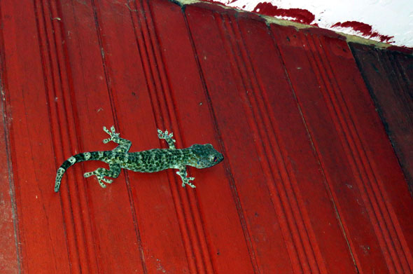 Kotiliskomme gekkonen oli paikalla, kun saavuimme. Sillä oli iltapalan aika. Mökki tömisi, kun se metsästi vikkelästi pieniä pörriäisiä. Aamulla herätessäni seinällä oli kaksi gekkosta. Toivottavasti ne eivät lisäänny tähän tahtiin, että meillekin jää sijaa.