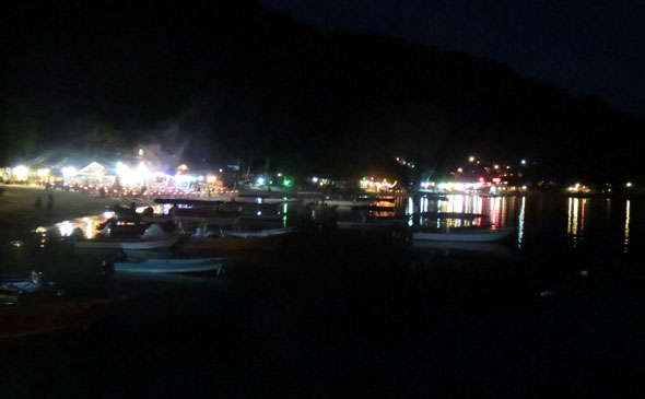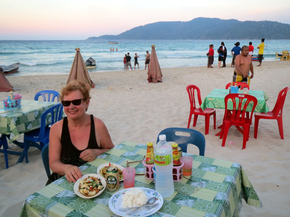 Auringon ja rantaelämän ohella päivän tärkein päätös on, missä syödä illallista. Meidän rantamme vastakkaisessa päässä lähellä laivalaituria on komea majatalo Shari-La. Se tarjoaa iltaisin BBQ-annoksia ja buffetin 25 ringetin hintaan (noin 6 euroa). Päätimme kokeilla.