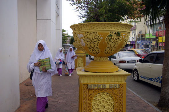 Huivipäinen tyttö tuli pian – en tiedä kummasta – ja esitteli meille innokkaasti kaupungin nähtävyyksiä. Kota Bharu on erikoistunut batiikkiin ja perinnelajihin kuten leijanlennätykseen.