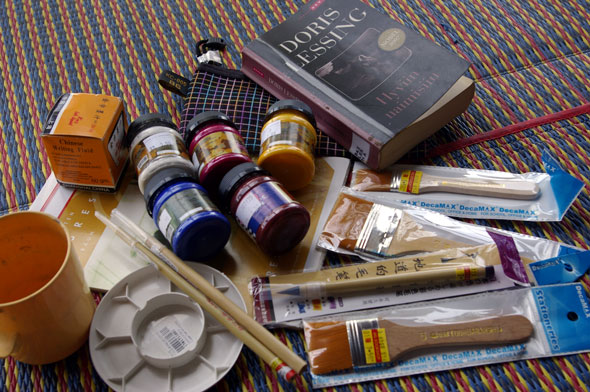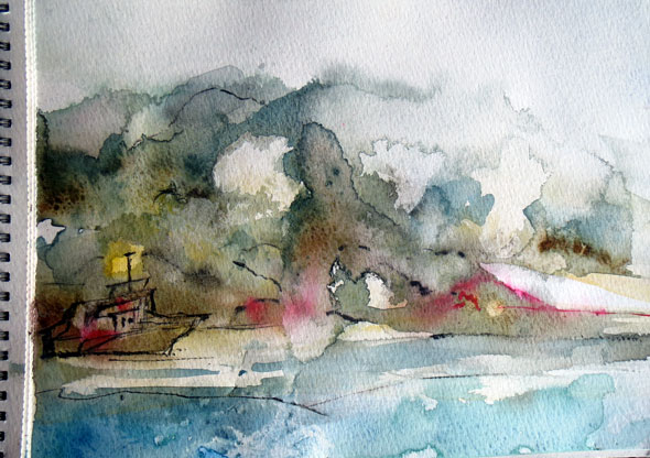Olimme koko sunnuntaipäivän aivan toistaitoisia. Eilinen annos aurinkoa ja matkajännitystä tuntuivat. Lepäilimme raukeina mökillä. Minä levitin maalaustarvikkeet pöydälle ja kokeilin uusia värejä. Iltapäivällä kävimme syömässä nuudelikeitot. Mantereen puolella ne maksoivat 3,5 – 4 ringetteä. Täällä on saarilisä, hinta tasaisesti 10 rahaa (runsaat kaksi euroa).