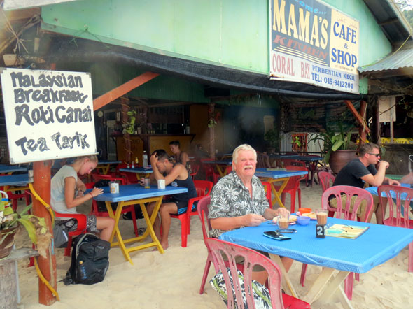 Meillä oli tiedossa retkipäivä naapurirannalle. Lähdimme reippaasti matkaan ja söimme matkalla pitkästä aikaa länsimaisen aamiaisen – kahvia, paahtoleipää, munakasta ja hedelmiä. Olimme yksimielisiä, että paistetut rotit ja teh tarik malesialaiseen tapaan ovat maukkaampia.