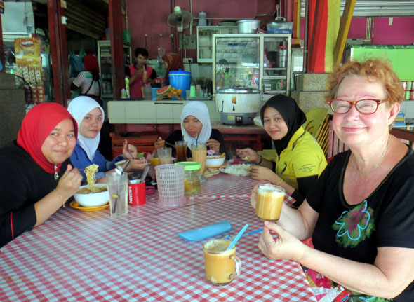 Teimme tänään perjantaina vain reippaan päiväkävelyn kaupungilla. Kaikki nähtävyydet ovat kiinni, sillä muslimeillä on pyhäpäivä. Pysähdyimme paikalliseen lounaspaikkaan juomaan teet ja syömään annokset nasi gorengia eli paistettua riisiä. Saimme paikat tyttöjen pöydästä. Kun tuli laskun aika, tytöt olivat hoitaneet sen sujuvasti puolestamme. Jussin charmi puri taas kerran.