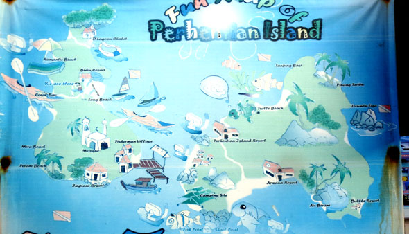 Perhentian saaria on kaksi, pienempi Kecil ja suurempi Besar. Me asumme pikkusaarella vasemmalla olevan kajakin kohdalla. Suosikkiuimarantamme Long Beach sijaitsee vastarannalla.