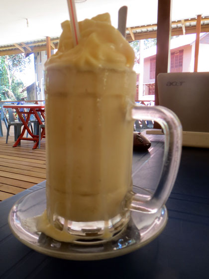 Vappupäivän aamuna nukuimme yhdeksään. Jussi riemastui, että sähkö toimii vielä. Hän ryhtyi kiehauttamaan meille kahvivettä, mutta myöhästyi. Söimme rantaravintola Ameliassa vappuaamun perinteisen silliaamiaisen sijasta tukevan currykeittoaamiasen ja jälkiruuaksi vielä herkullisen mangomilkshaken.