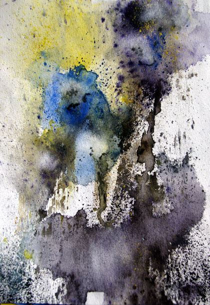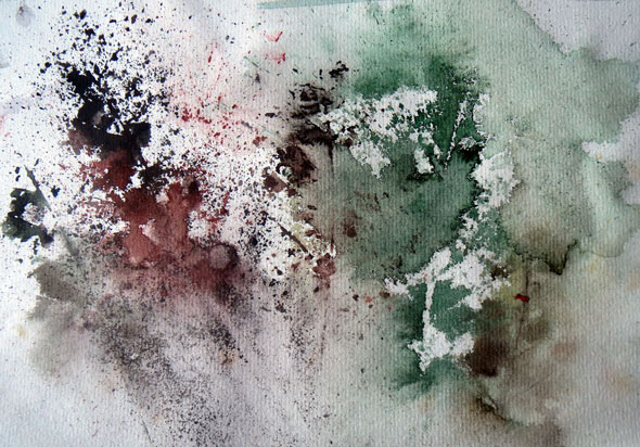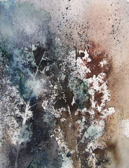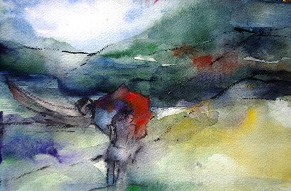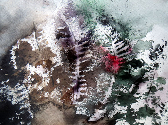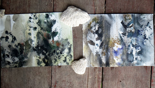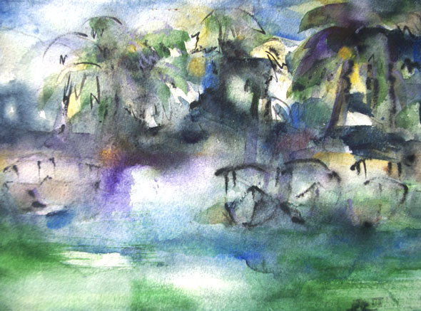 Maalaaminen tosin loppui jo eilen siitä yksinkertaisesta syystä, että olen käyttänyt kaikki mukana olleet akvarellipaperit. Viimeisin kävin hakemassa kivikosta, jonne tuuli sen lennätti. Onneksi on vielä jäljellä ohutta ingres-paperia, jolle olen tallettanut viidakkotunnelmia.