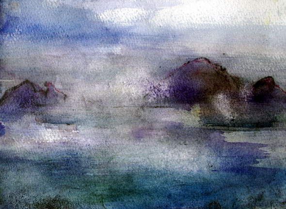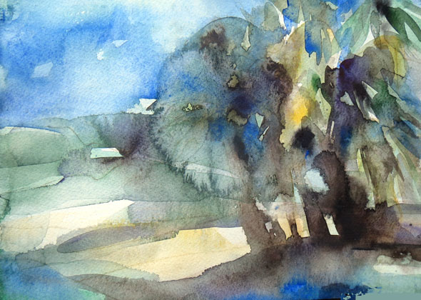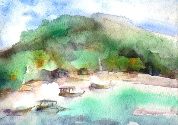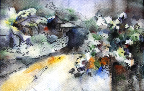 Olen aina hehkuttanut, että maalaaminen, matkustelu, hyvä ruoka ja hyvä seura takaavat onnellisen elämän. Elän parhaillaan unelmaani. Tässä ja nyt – ei sitten joskus. Akvarellimaalaus on sujunut ilahduttavasti. Kostea paperi kuivuu tuulessa sopivan vikkelään. Sen ansiosta kuullottaminen onnistuu ilman turhia viiveitä.
