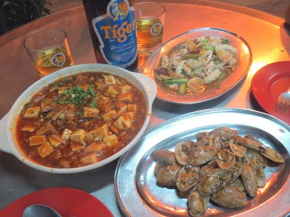 Illalla löysimme itsemme taas kerran ruokakatu Alorilta. Tilasimme mikkihiiriravintolassa tofua, mustekalaa ja pikkusimpukoita. Chilissä ja valkosipulissa wokatut lala-simpukat olivat syntisen hyviä.