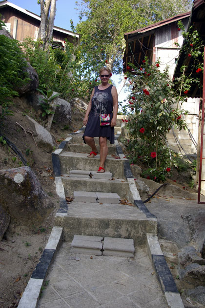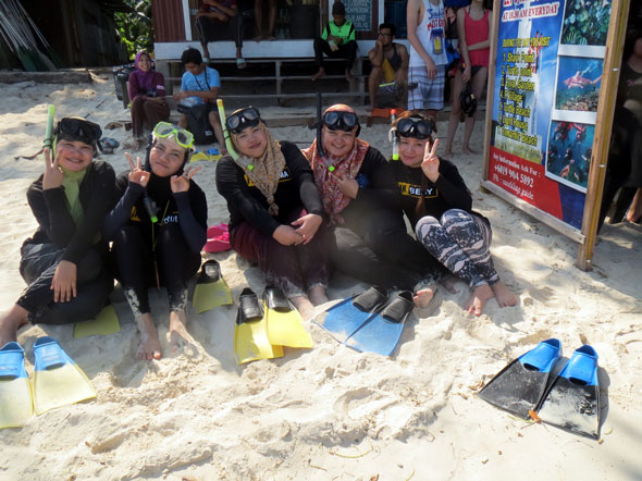 Arvelimme, että puolentoista saariviikon jälkeen uskallamme lähteä meriseikkailulle. Varasimme kolmen tunnin snorklausretken. Viiden hengen seurueemme oli kansainvälinen. Kippari oli malesialainen. Nuoripari, joka taisi olla honeymoonilla, oli Argentiinasta. Minua vähän arvelutti, miten onnistun kapuamaan merestä kiikkerään veneeseen. Hyvin se kävi, sillä olemme saaneet täällä hyvää harjoitusta kiipeillessämme kivisiä portaita kukkulalla sijaitsevalle kotimökillemme.