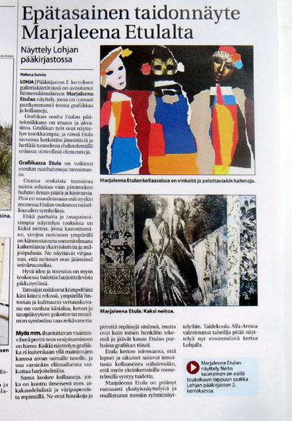 Lohjan pääkirjastossa on toukokuun ajan esillä hämeenlinnalaisen Marjaleena Etulan grafiikkaa ja kollaaseja. Etulalla on nyt näyttely ensimmäistä kertaa Lohjalla ja esillä on mm. nais- ja eläintutkielmia. Etulan etsaukset ovat herkän taidokkaita, kollaasit taas riehakasta repimistä.