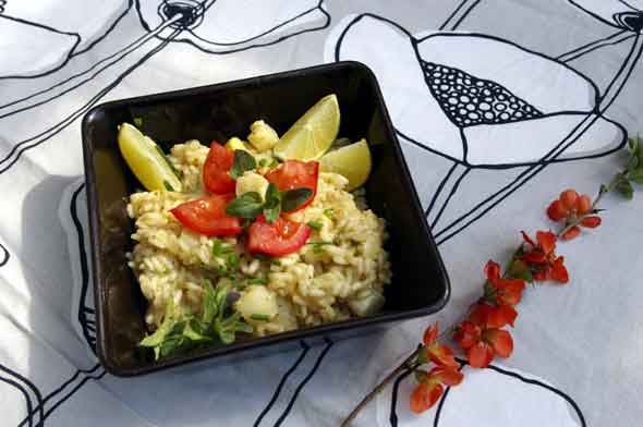 Säästin muutaman keitetyn parsan ja keitinliemen risottoa varten. Muuten noudatin pussin ohjeita. Paitsi lisäsin tietysti yhden hienoksi kuutioidun keltasipulin heti alkuvaiheessa. Risotto on tarkka riisin kypsyysasteesta. Onnistuin muuten hyvin, mutta kuumalla liedellä ei kannata seisottaa valmista risottoa. Sen seurauksena liemevä annos kuivuu turhan helposti. Ensi kerralla uusi yritys. ”Risotto ei odota syöjiä vaan syöjät odottavat risottoa”, pätee.