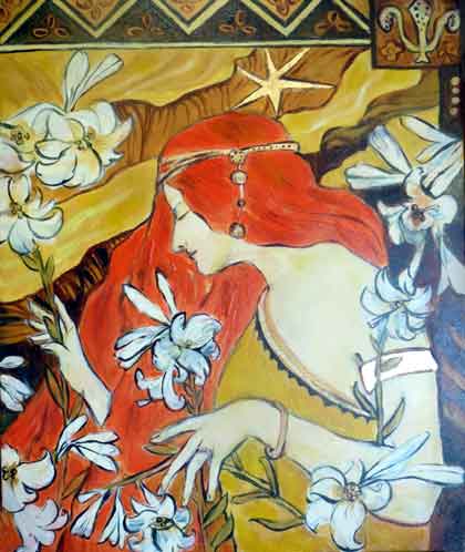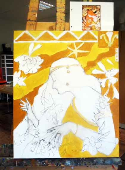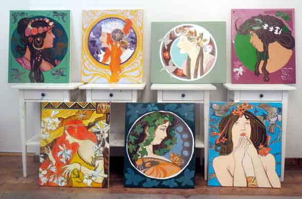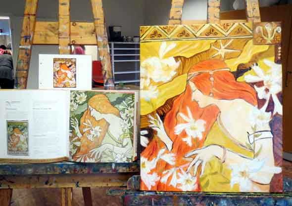 Vaikka lopputyöhuuma on kiivaimmillaan, irrottauduin hetkeksi herkistelemään kauniiden kuvien parissa. Maarit opastaa minua ja kuutta muuta esteetikkoa art nouveaun koristeelliseen maailmaan. Kurssi kestää neljä iltaa. Sen aikana meidän pitäsi saada yksi maalaus valmiiksi. Saimme valita mieleisemme mallikuvan. Suurin osa oli Alphonse Muchan tuotantoa. Minun valintani osui Paul Émile Berthonin neitoseen.