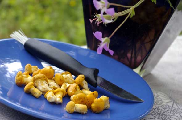 Jussinpäivä oli yllätysten päivä. Löysimme metsälenkillä peukalonpään kokoisia kantarelleja. Koska ne olivat keskellä polkua, maltoin poimia meille maistiaiset. Hetken käveltyämme ojanpientareella komeili kookas punikkitatti.