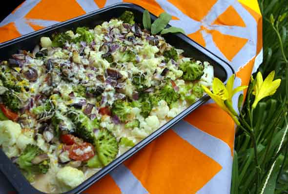Ladoin kaikki ainekset laakeaan vuokaan. Kuumensin uunin 225 asteeseen ja pidin paistosta siellä parikymmentä minuuttia. Lisäsin loppuvaiheessa pinnalle vahvaa juustoraastetta. Tarjosin ruuan höyryävän kuumana kirpeän punaherukkahillon kera.