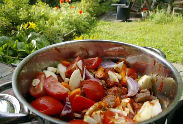 Odottelemme vieraita. Jussi halusi tarjota kunnon lihapadan Kreikan matkamme hengessä. Hän osti lammasta ja luista keittolihaa. Kesäkeittiöstämme levisi illan mittaan huumaava tuoksu, kun lihat kypsyivät hiljaa poristen puna- ja keltasipulien, valkosipulin, porkkanoiden, tomaattien ja yrttien kera lähes viisi tuntia.