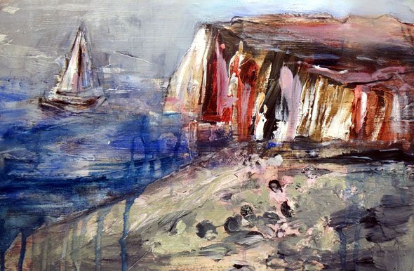 Sain valmiiksi myös kalliomaiseman, jonka aloitin sormimaalauksena. Se on teettänyt runsaasti työtunteja eikä lopputulos ole ollenkaan niin raikas kuin purjetuulessa.