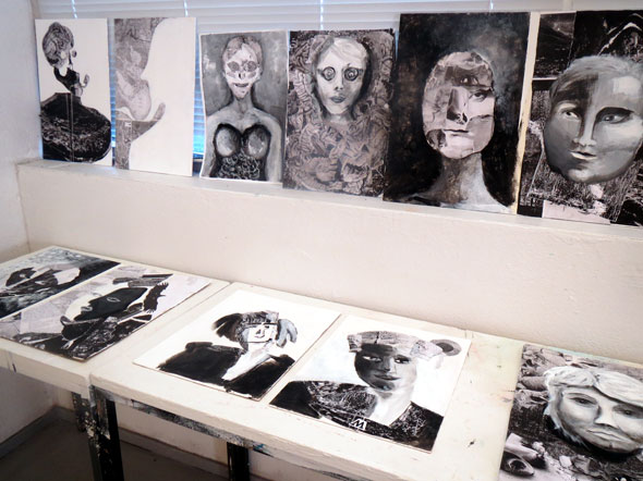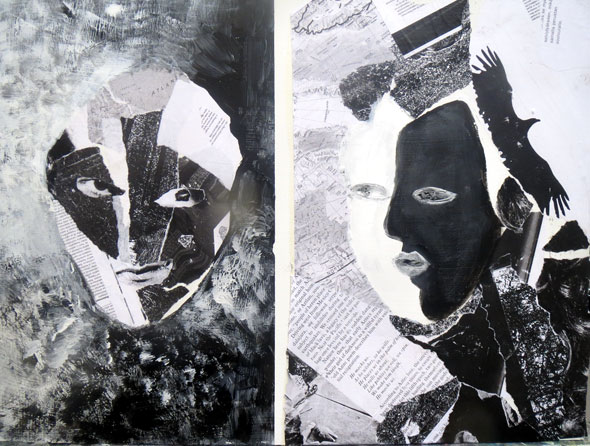 Teimme verryttelytehtävänä kollaasin. Aiheena oli omakuva. Mikäpä sen kamalampaa. Tehtävänannon mukaan teimme kaksi kollaasia, toiseen omat kasvot, toiseen taustan. Sen jälkeen maalasimme mustalla ja valkoisella akryylivärillä valkoisiksi jätetyt alueet. Minulle tehtävä oli mieluisa – kiitos Vanajaveden opiston kollaasikurssin. Moni vaikeroi, etteivät kollaasit ole heidän heiniään. Huomenna pääsemme sitten asiaan.