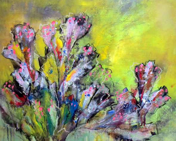 Otin heti öljyvärit käyttöön. Dammarin ja auringonpaisteen avulla työt kuivuvat kohtuullisen nopeasti. Kokeilin valutusta, sillä horisontaalinen maisema kaipasi pystylinjoja.