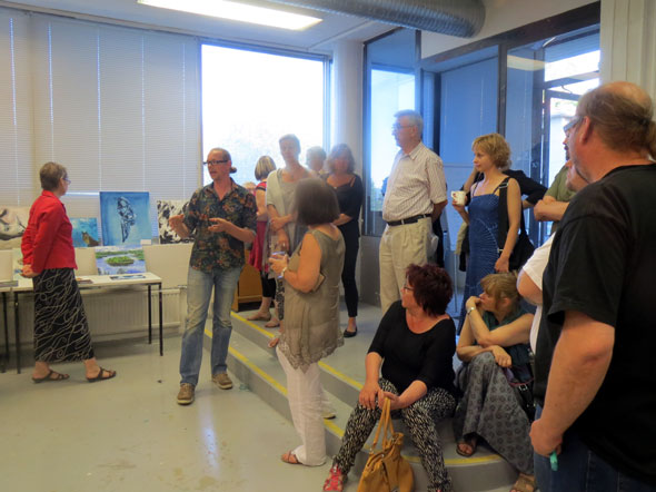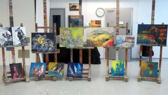 Ateljeessamme oli oikea taidenäyttelyn avajaistunnelma. Olimme tyytyväisiä, kun saimme esille hienon kokonaisuuden. Yleisökin arvosti. Lauantaina meillä on vielä kritiikki. Kurssi päättyy lounasaikaan.